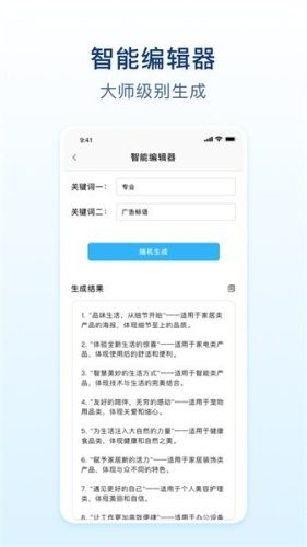 易撰文案app是一款文案撰写工具。丰富的文案素材任意选择,强大的功能生成系统随时都能进行文案生成,全面化的操作过程使用起来轻松便捷,满足大部分用户们的需求,有需要的快来下载吧!