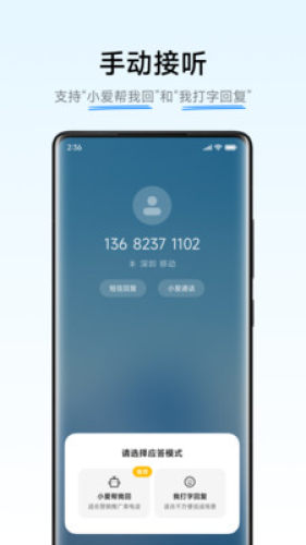 【手动接听】:支持【小爱帮我回】和【我打字回复】2种模式,帮你解决不方便说话接听的问题
