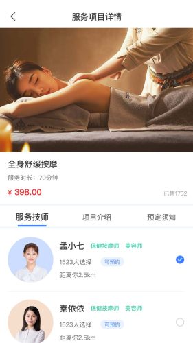 可以根据自己的身体情况,选择适合的按摩项目,查看项目介绍,可以筛选服务商按销量排序,按评价排序,按好评排序