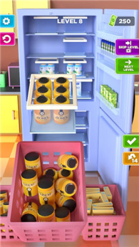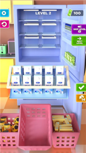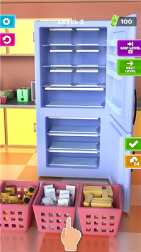 3、指尖上的简单操作更适合所有人,游戏以日常生活为背景,还原生活,购买大量物品放入冰箱,并将所有物品放入冰箱的储物盒中的设定,打造出堪比真实体验的储物游戏。