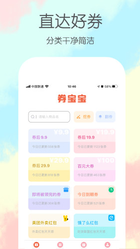 券宝宝app是一款专为用户们打造的福利优惠劵购物软件应用,每日都有海量优惠劵免费发放,用户可随时搜索查找,种类齐全,还有不定时发放红包哦!