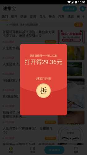 1、新用户进行速推宝app下载安装就有0.5元新人奖励,首次分享文章、提现、邀请好友还能获得29.8元现金奖励