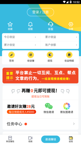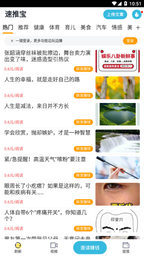 2、转发文章单价0.6元/阅读,支持上传文章,邀请收徒奖励28元/人,还有两级20%+10%永久提成