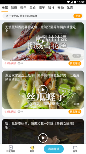 1、点击速推宝app内的“转发赚钱”或“视频”频道任选一篇文章/视频进入后点击右下角“立即分享赚钱”按钮