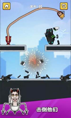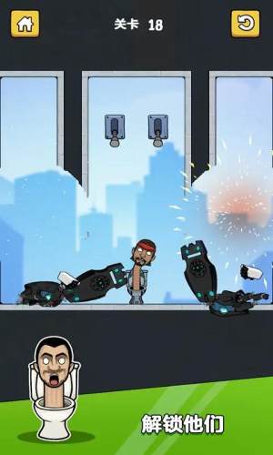 拥有卡通风格的可爱画面和搞笑音效,采用流畅的动画呈现马桶人和摄像师的对抗。