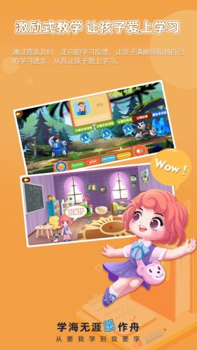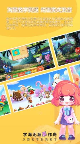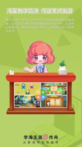 教学资源采用纯正的美式发音团队和海量的动画资源,让孩子沉浸在轻松有趣的英语场景中,主动开口说单词、选单词及拼写单词,自然提升孩子的英语水平。
