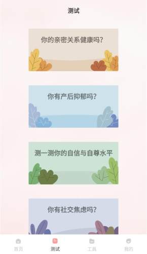 桃心理app是一款专业好用的心理测验软件。桃心理app功能十分全面,包含了性格测试、九型人格测试等诸多专业测试,帮助你更加清晰全面的认识自己。现在下载软件,解决你的心理问题,成为更好的自己。