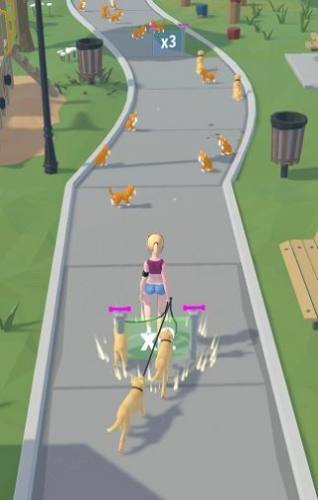 遛狗之路是一款收集流浪狗躲避小猫的跑酷手游,玩家要在这条遛狗之路上尽量多的收集流浪狗,并牵着它们走到终点,让它们回到狗舍里,但是在途中你收集到的狗狗会挣脱绳子去追赶流浪猫,如果你手里一只狗都没有就会失败,所以尽量躲避那些烦人的流浪猫吧。