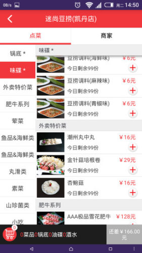 4)菜品选择页面,进入到此页面,您可以选择自己喜欢的菜品和锅底,点击【选好了】等待页面跳转
