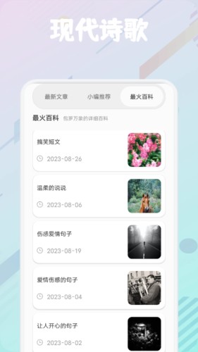 2、小说、散文、诗歌、科技等多种类别文章,满足用户多元化的阅读娱乐需求。