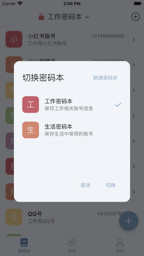 1. 支持多密码本:您可以创建多个密码本,每个密码本保存多个账号。