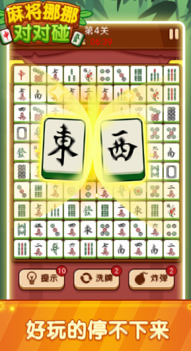 游戏中,您需要找出两个相同的麻将,并将它们滑动到同一竖行或横行,通过点击消除它们。