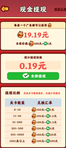 2、每消除一关都可以领取到对应的红包奖励哦,心动的玩家还不赶紧一起玩游戏领红包啦!