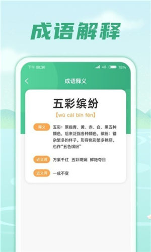3、清新多样的游戏玩法:软件拥有清新的界面风格,同时提供多种有趣的游戏玩法,让用户在学习成语的过程中能够享受到乐趣。