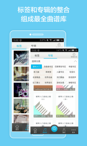 App里有我们用心整理的钢琴曲谱专辑,包含流行、古典、轻音乐、爵士等音乐分类。