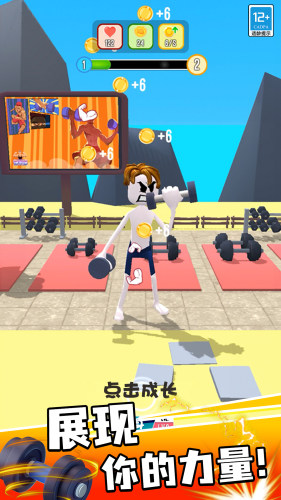简单易上手的游戏机制。通过不断点击完成在健身房内的锻炼,让角色不断成长强壮,在赛场上轻松战胜对手。