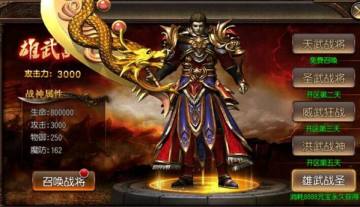 战神和角色类似,也有一定的生命值,攻击,防御以及魔防。战神按能力值由低到高分为五类:天武战将、圣武战将、威武狂战、洪武战神、雄武战圣。随着等级的提高,战神的所有属性也相应提高。最初级的天武战将可以直接免费召唤,而其他三个分别在开区第二天,第三天,第五天才可以召唤的哦。最终极的雄武战圣则是需要花费一定元宝从永久获得!
