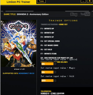 格兰蒂亚2:周年版十项修改器提供另外无限HP、无限道具、设定特殊钱币、增加100经验值等功能,使用时请先运行游戏,再打开本修改器。