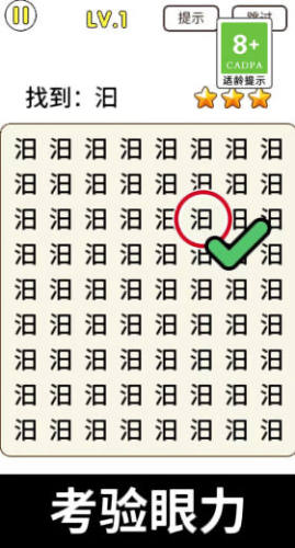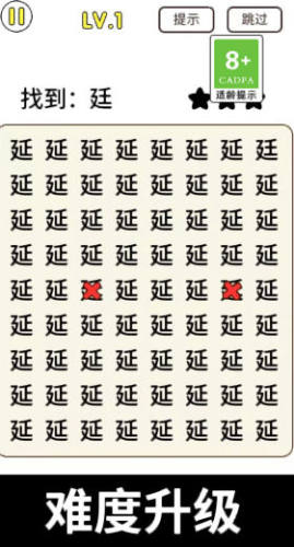 一款独特的益智游戏,让您能在茫茫字海中挑战自己的文字智慧,寻找那一个与众不同的字,越是简单的文字找起来可能更困难哦,你也来试试看吧。
