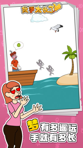 -不小心在海上失去方向饥肠辘辘怎么办?眺望远处发现小岛上有新鲜可口的椰子!看我无限拉伸手臂,躲避夺食的海鸥和海里的食人鱼,轻松摘取食物。
