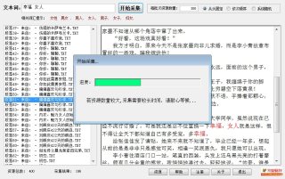 由于是计算机自动匹配以及汉语的自身特点,软件采集出来的素材会有很多是没用的,有的专指性强一些的词汇效果好一些,有些泛指性强的词汇效果就比较差。在使用本软件时一个重要技巧是学会选择词汇,主要是两点:一是用多个词汇进行组合限制,可是找到的素材更准确,但若组配词汇过多,则采集到的内容数量会大大减少,一般用2-3个词汇为佳。二是多采用某一方面素材很可能经常出现的相关词汇进行采集,如:要采集描绘男女情爱的词汇可以用:激动、兴奋、呻吟、抚摸、亲吻、拥抱等等(还有一些更具体的,大家自己联想,呵呵...),这样采集出来的素材准确率几乎100%。