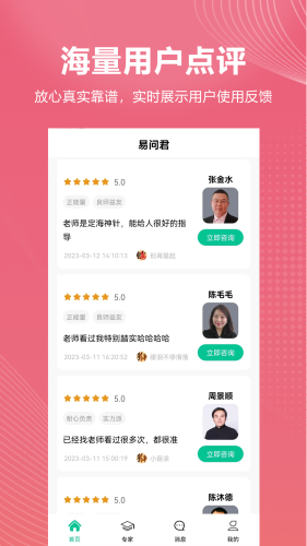 易问君app是一款很好的咨询软件,它的咨询内容很广泛,涉及到了学业、财富、事业、情感等各个方面,可以为不同的用户提供咨询需要,用户可以通过在线咨询或留言问答的形式,提出自己的疑惑,也可以向他人解答疑惑。