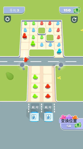 在厕所排队这个有趣的游戏中,您需要根据人物的颜色将他们分类,让他们排队使用厕所。通过解锁关卡,您可以赚取金钱,用来解锁更多具有挑战性的关卡和额外的厕所。