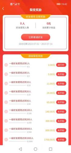 1、一级好友提现人数达到1人领取2元推广裂变奖励,以此类推,最高人数为5000人奖励高达9999元,具体推广奖励详情前往APP查看,活动时间7月1日-7月31日结束。