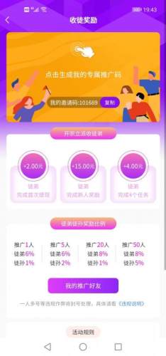 3、推广1人提成奖励提升到6%,推广5人提成6%,推广20人下级任务分成8%,推广50人二级提成由1%提升到5%。