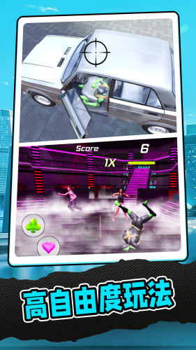 1、自由探索纽约市,快速穿梭在摩天大楼之间,并在城市中寻找邪恶势力的踪迹;