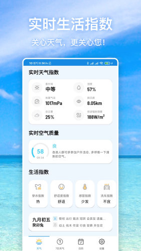 我们实时收集和更新天气指数,例如紫外线、实时空气质量、湿度指数、风力等。帮助您了解当下的天气状况,如防晒、穿衣、保湿,户外运动建议等。