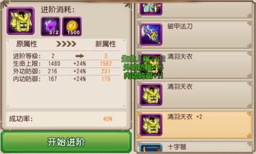 装备进阶:强化终究有极限,于是有人通过使用晶石淬炼来进阶装备,进阶可以百分比大幅度提高装备的属性,但其成本昂贵同时有一定概率失败。