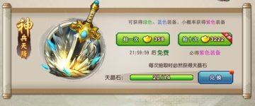 只要在神兵降临中捐献一点元宝,就可以拿到最高品质为紫色的装备,如若英雄囊中羞涩也不要紧,每隔一段时间神兵降临都会免费送您一件装备,几率与主动捐献完全相同!