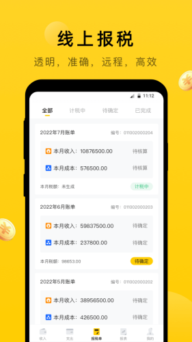 3、报税单:帮助企业将每个月数据进行整理汇总成报税单,可以实时查看每月报税情况。