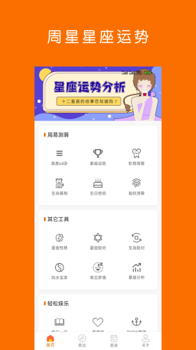 新鲜有趣的星座娱乐软件工具。提供星座测算占卜,给你星座指引,把握星座运势前程。可以详细了解星座起源和特点,让您更好掌控星座性格,探秘星座的一切。