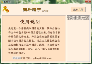 使用方法也很简单,先选取一个你要提取图片的文件,明星图片猎手会自动将文件中包含的PNG图片提取出来,保存在本软件所在的文件夹里