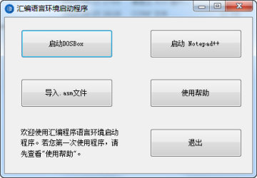 初次使用汇编语言环境一键配置工具,可以先查看使用帮助,然后再进入下一步操作,如“启动DOSbox”、启动“Notepad++”、“导入.asm文件”等。