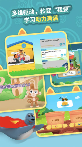 源自《牛津自然拼读天地》、形象生动且个性鲜明的拼读伙伴引导和参与孩子的学习全过程,提供有情感的陪伴,激发孩子的自主学习热情与动力。