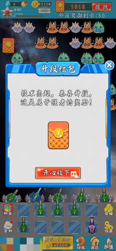 星际防卫战,一款经典的射击赚红包小游戏,集合合成玩法只要合成相同的炮台升级炮塔射击怪物闯关成功就有红包拿,注意炮塔升级增强火力可以消灭更多怪物的。