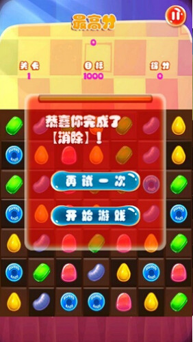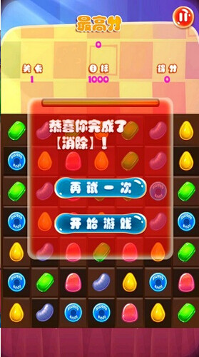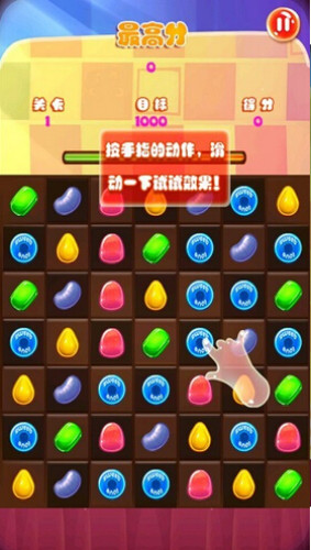 游戏中各种糖果不断的从地下涌向顶端,点击两个以上的糖果进行消除,同时消除相同种类的糖果越多得到的分数就越多,在糖果不断的上升中快速的点击消灭它们。还可以在游戏开始前购买在游戏中有利的道具,使你在游戏中得到更好的成绩。使用积分加强可在游戏结算时提高30%的最终积分;使用神圣保护可在糖果达到顶部时触发,自动消除下侧3行糖果,从而继续游戏;使用消除提示可以在游戏中时刻提醒你可消除的糖果。