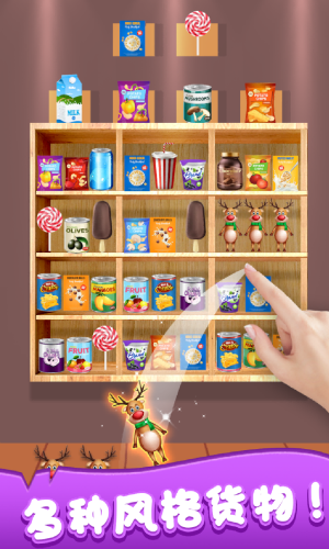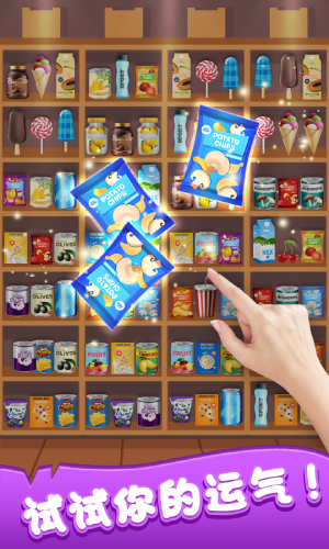 1、通过拖动相同的产品到货架上,进行匹配或三重匹配,消除货柜中的物品,获得分数并进入下一关卡。