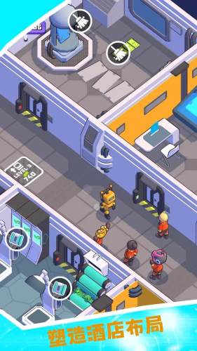 我的太空酒店中可以自由设计和布置太空酒店的各项设施,包括客房、休闲区、娱乐设施等。通过合理运用资源,进行设施建造和升级,优化酒店经营效率。