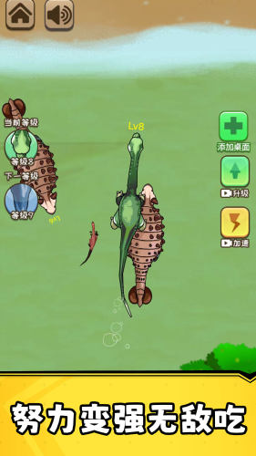 以恐龙为题材的休闲益智类小游戏,游戏开局玩家化身为小恐龙,慢慢吞噬同类增大自己的体积,达到一定的阶段就会进化成为更强大的恐龙。