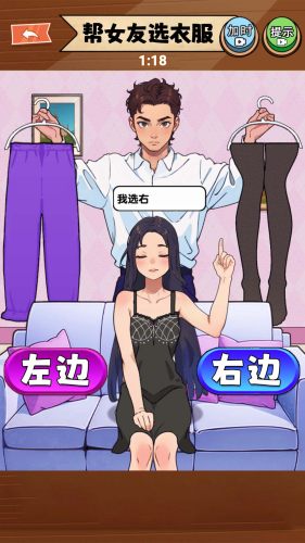 穿搭美美哒游戏是一款换装游戏,你的女朋友可以选择左右两边不同种类的服饰,并将它们搭配在一起,从而创造出一个时尚、个性化的穿搭组合。你可以选择不同的服饰类别,例如裙子、裤子、上衣和配件等等。当你选择一个类别时,界面上会显示出该类别下可用的所有服饰,你可以挑选其中的一项,然后将它们搭配在一起。