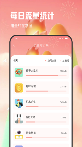 实时统计各应用的流量使用情况,进行分布排行,方便大家查看。设置每日流量上限和提醒功能,使用完会提醒你并自动关闭数据,针对性的制定专属的流量使用计划。