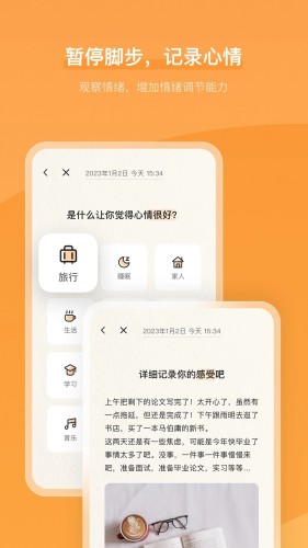心情记录有助于我们提升认知与情绪管理能力。在心境旅途中,我们可能会见证潮起潮落,经历阴晴雨雪。心情记录功能是旅途中的驿站,将旅途中的见闻与自己的想法和心情记录下来吧。