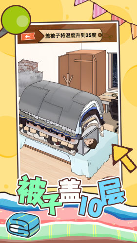 被子盖10层是一款轻松有趣的益智解压游戏。在这个寒冷的季节里,我们的小老弟只穿着一件背心在床上,他需要你的帮助来盖被子!