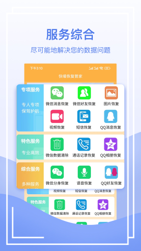 快喵恢复管家app下载,一款功能多适用广的手机误删丢失数据一键找回工具,通过快喵恢复管家app快速恢复聊天记录,恢复图片数据等,有需要就来下载。