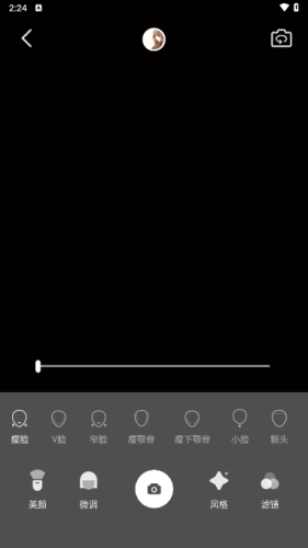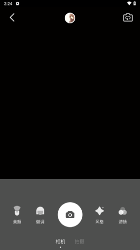 2、选择相机后即可进入美颜相机界面,上方为相机选景框,选景框下方则是各个美颜滤镜功能,大家可根据需要使用。