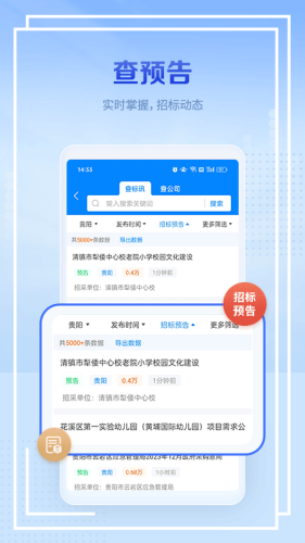 1、项目实时查询,随时查看招标预告、公告、中标、变更、采购等信息;